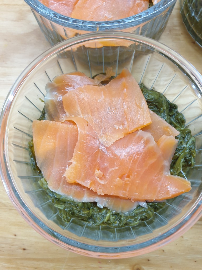 - Add salmon: Place a layer of smoked salmon on top of the spinach.