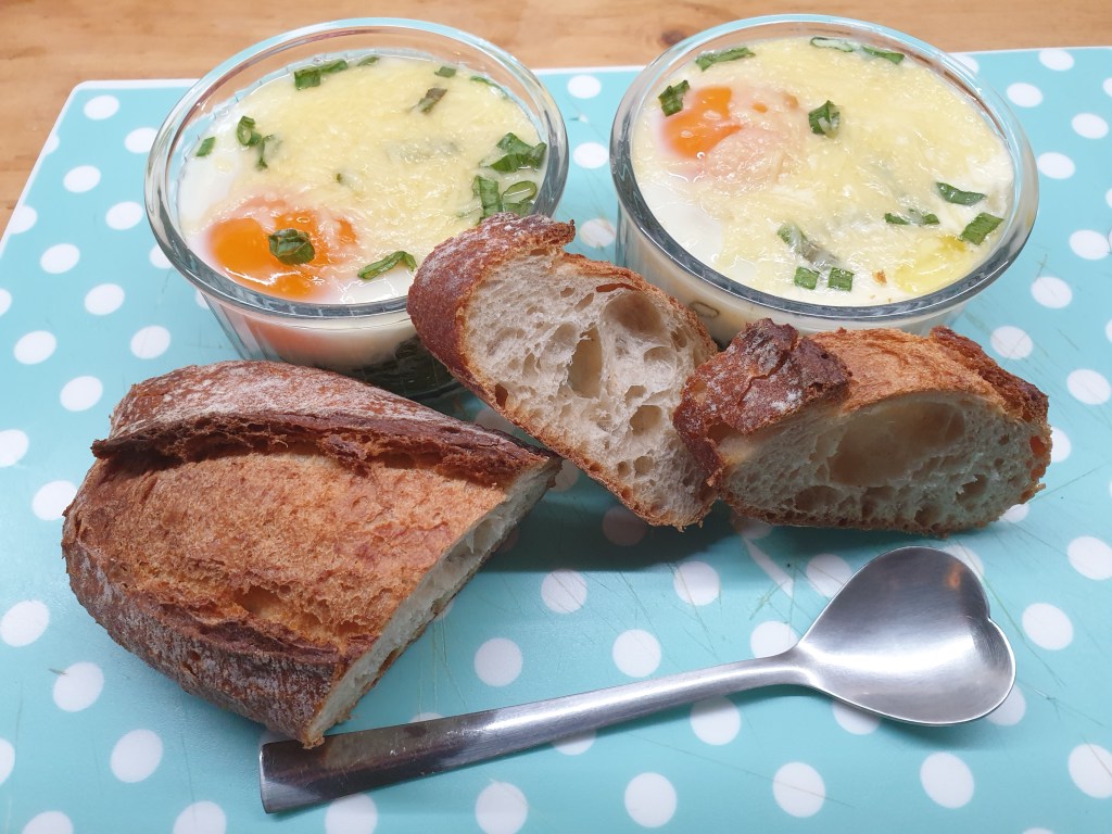 - Baking: Place the dishes in a deep baking tray and pour hot water into the tray until it reaches about halfway up the sides of the dishes. Bake in the oven for about 15-18 minutes, or until the whites are set but the yolk is still soft.