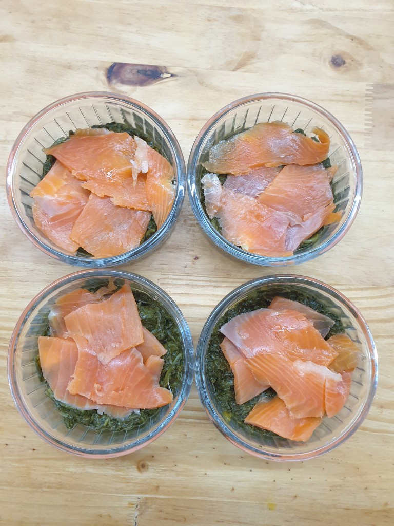 - Zalm toevoegen: Leg bovenop de spinazie een laagje gerookte zalm.