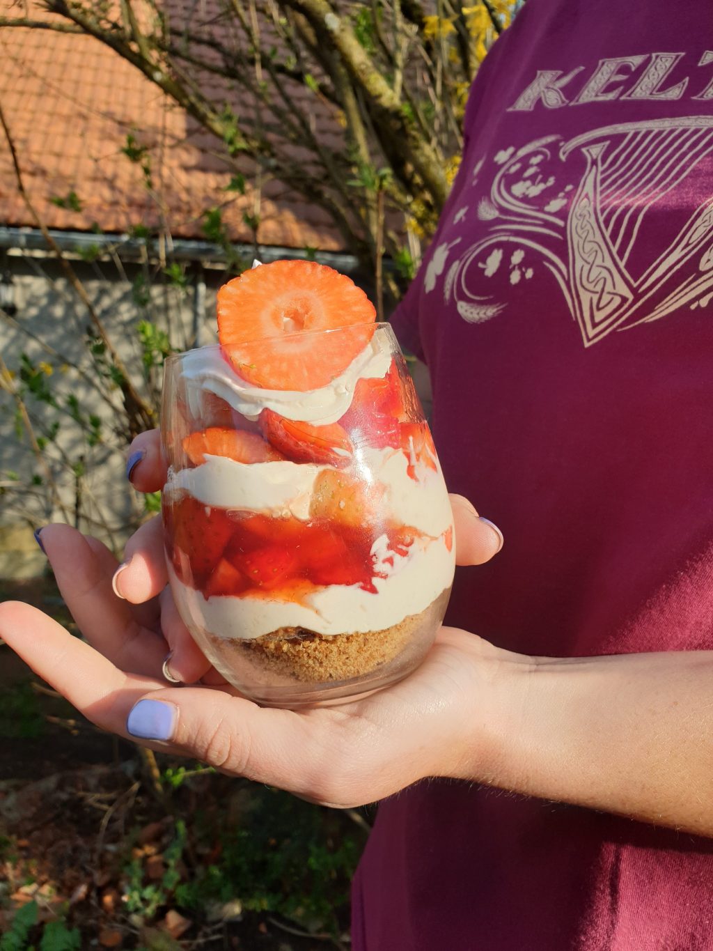 - Herhaal de lagen indien gewenst en decoreer met een hele aardbei, of wat plakjes aardbei.