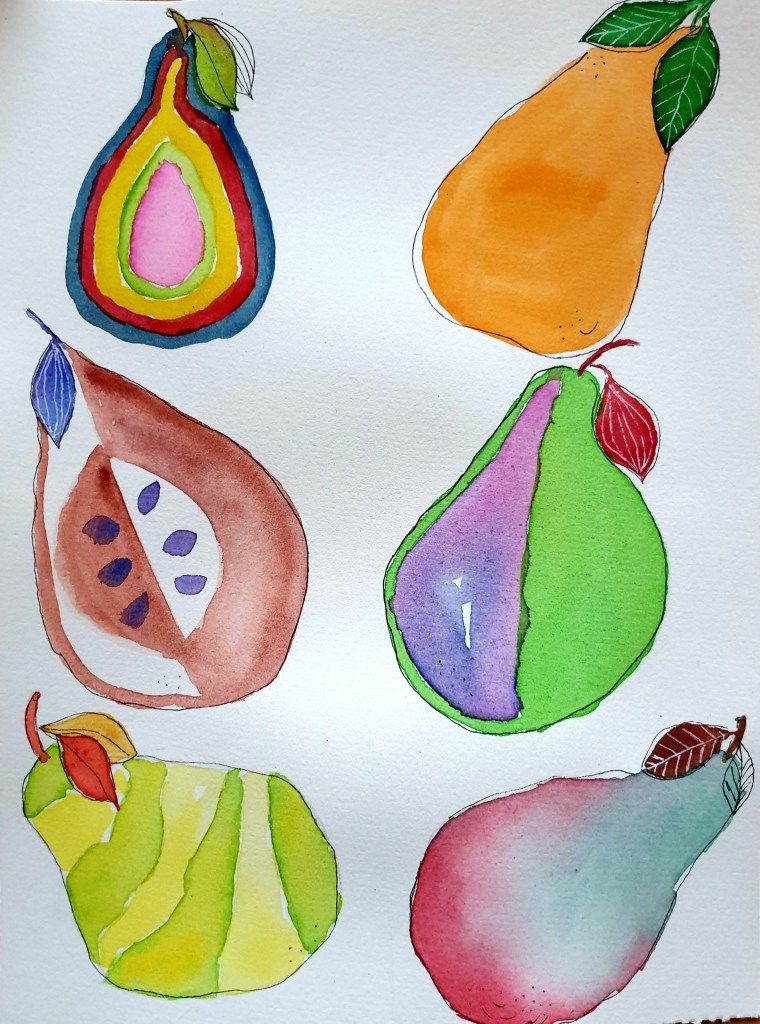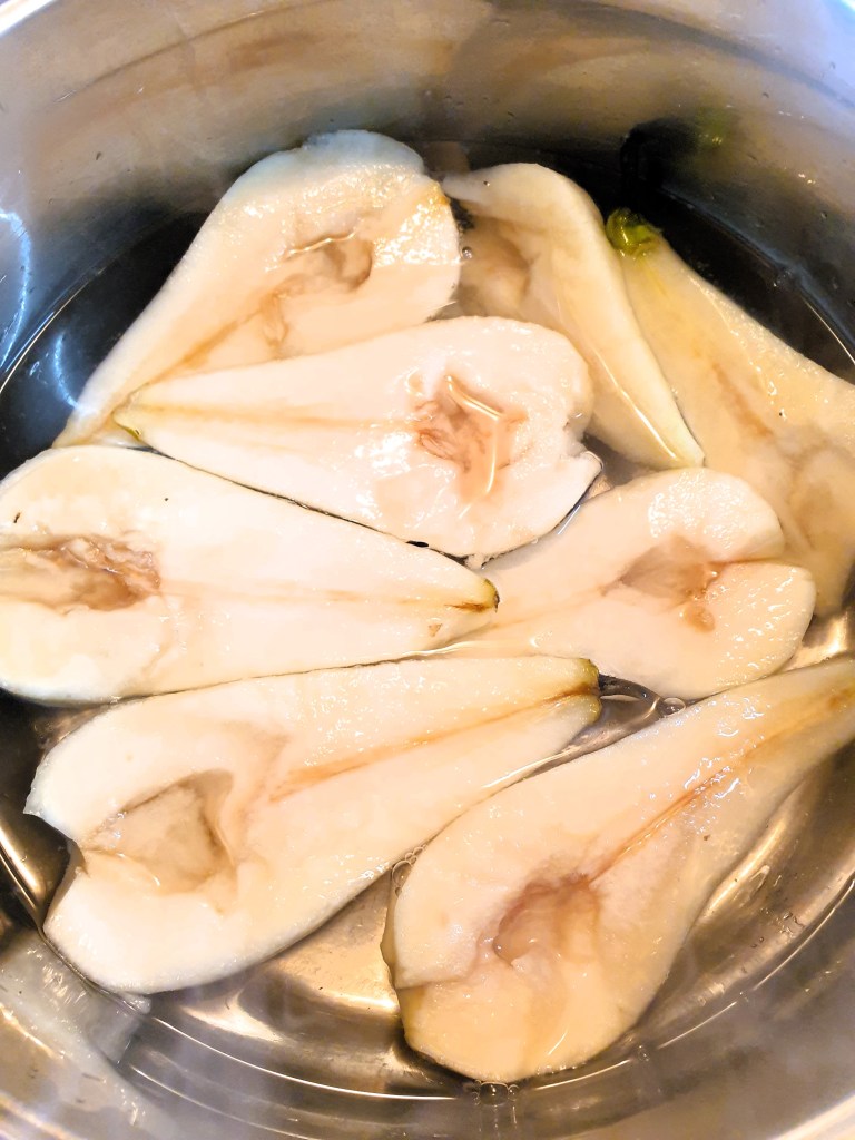 - Schil de peren, halveer de peren, verwijder het klokhuis. Het klokhuis kan je makkelijk verwijderen met een meloenbolletjeslepel. Heb je die niet gebruik dan een kleine lepel. Aan één van de helften laat ik het steeltje zitten, dat vind ik leuk staan.