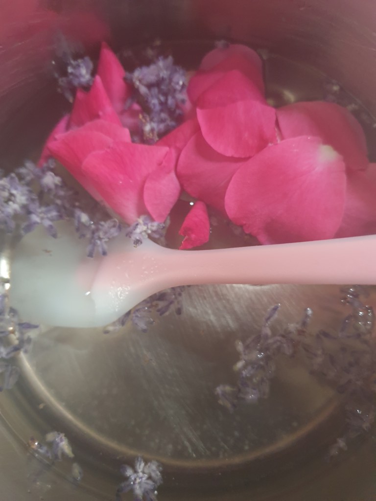 - Voeg de lavendel en rozenblaadjes toe en laat nog 15 minuten trekken.