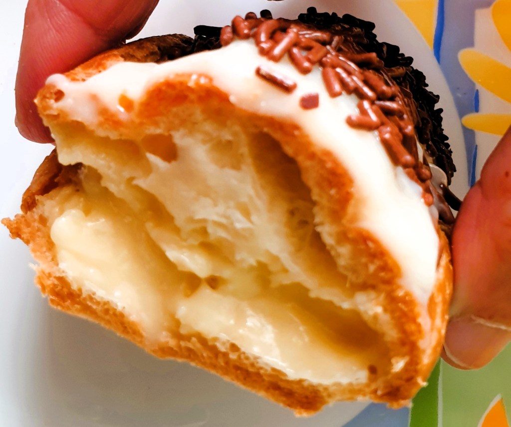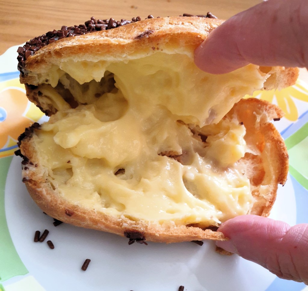 - Snijd een klein gaatje in de onderkant van elke choux en vul ze met de afgekoelde banketbakkersroom, gebruik hiervoor een spuitzak. Ik heb mijn soezen door midden gesneden en gevuld.