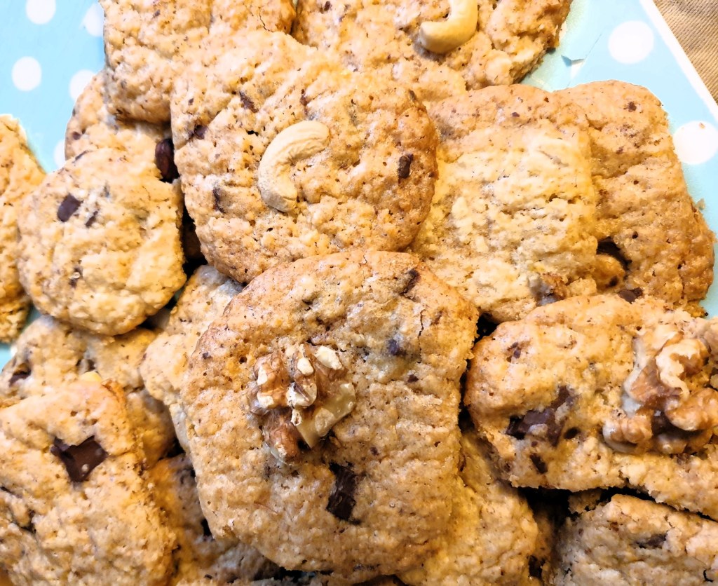 Je kunt de koekjes naar wens vullen met pure chocolade, grof gehakte noten, rozijnen of stukjes fruit. Vandaag heb ik gekozen voor grof gehakte pure chocolade en walnoten uit onze eigen tuin, samen met wat andere noten die ik nog had liggen. Ik bakte ze op 200 graden gedurende 15 minuten. In het begin zijn ze nog zacht, maar terwijl ze afkoelen, worden ze heerlijk krokant. Dit recept leverde me zo’n 15 koekjes op, perfect voor deze tijd van het jaar!
