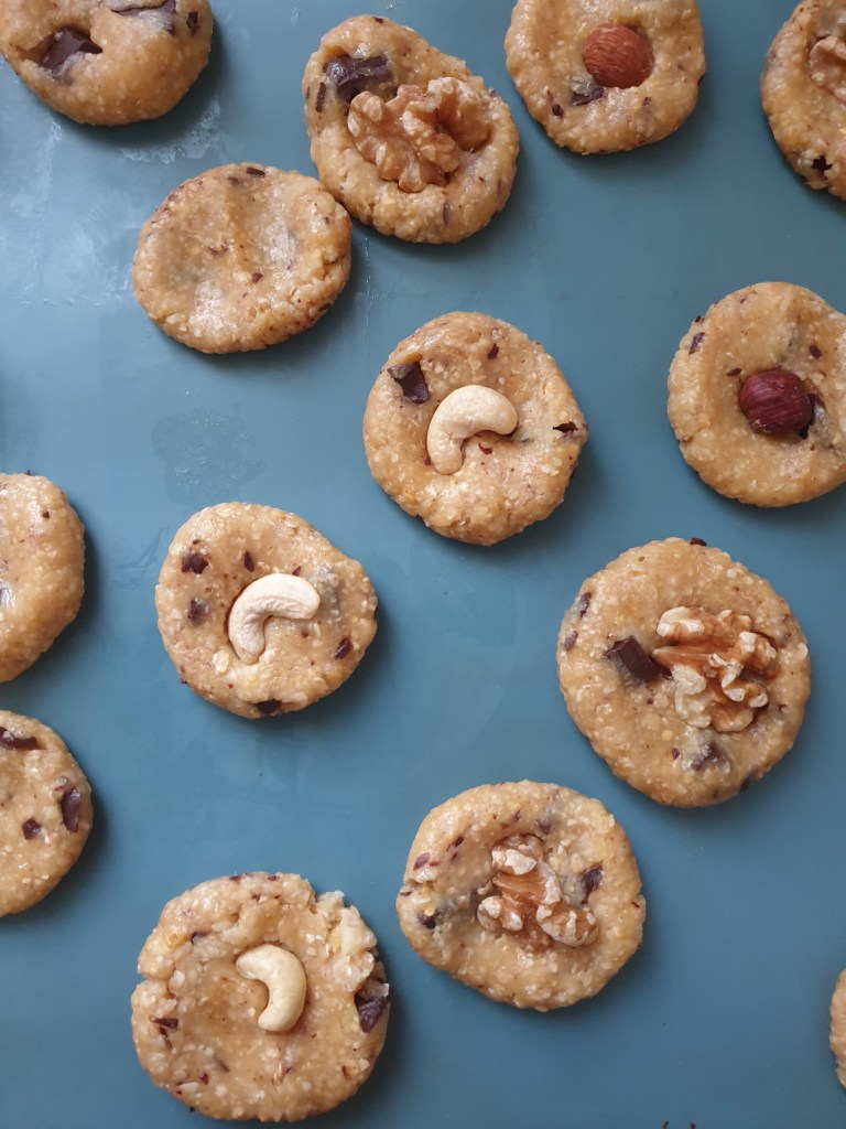 De koekjes, ze zijn heel lekker!De koekjes voordat ze de oven in gaan, ik heb de noten er als laatste ingedruktHet deeg, het is nog wat plakkerig dat is geen probleem voor de koekjes