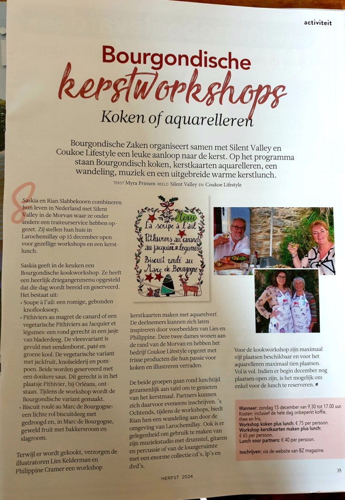 Nous continuons avec joie et optimisme, et les idées ne cessent de venir. Nous trouvons notre inspiration chez nos voisins – les vaches, nos compagnons de promenade – les chiens, nos quatre chevaux, et la magnifique nature sauvage qui nous entoure. Les nuits ici sont d’un noir d’encre, et par temps clair, on peut voir des milliers d’étoiles. C’est calme, à part le doux bruit d’une chouette ou d’un autre animal nocturne. C’est très différent des Pays-Bas, où j’étais toujours entourée de lumière et de bruit. Le contraste entre la vie trépidante de la Randstad et la tranquillité de la campagne bourguignonne est immense, mais c’est justement dans ce silence que je trouve la paix, les idées et le bonheur.