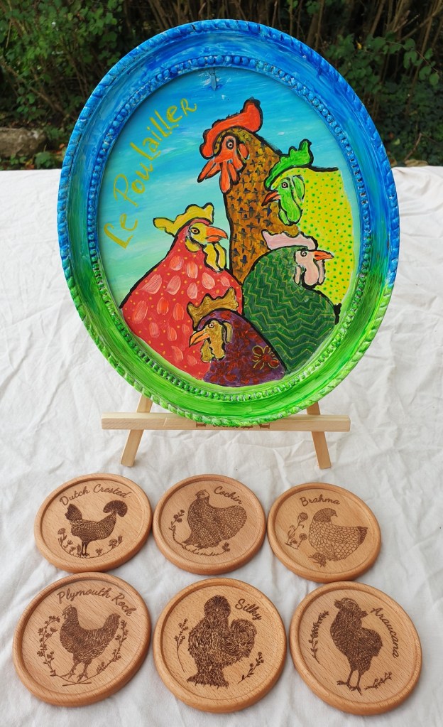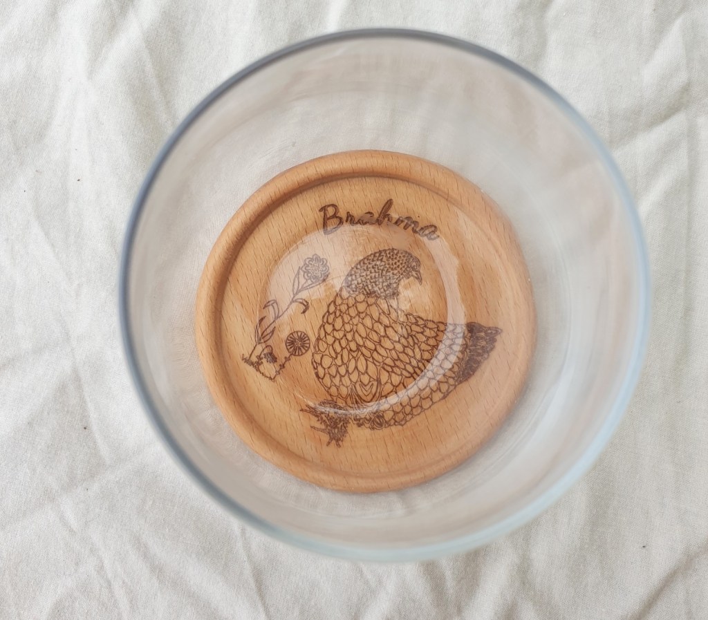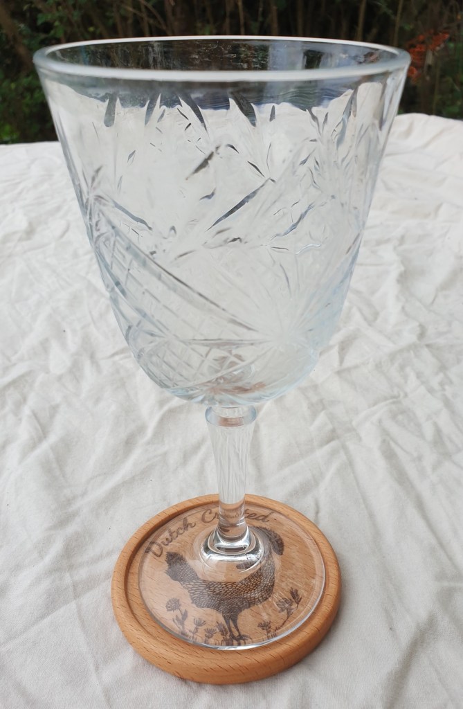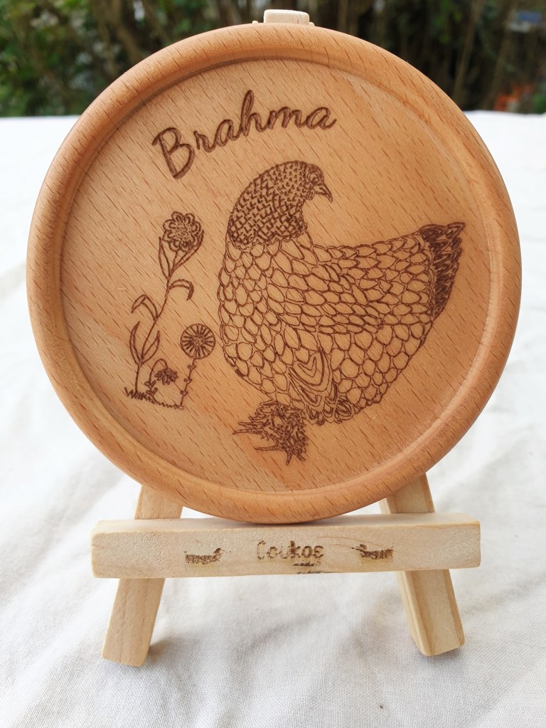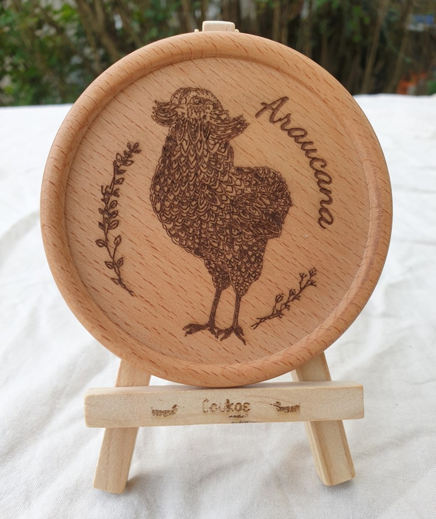 Voor nu ben ik super trots op mijn eerste project: kippenafbeeldingen gegraveerd op elegante beukenhouten onderzetters, met een mooi opstaand randje. Het heeft me veel geleerd, en mijn eigen kippen hebben model gestaan – daarvoor hebben ze een extra handje mais gekregen als bedankje!