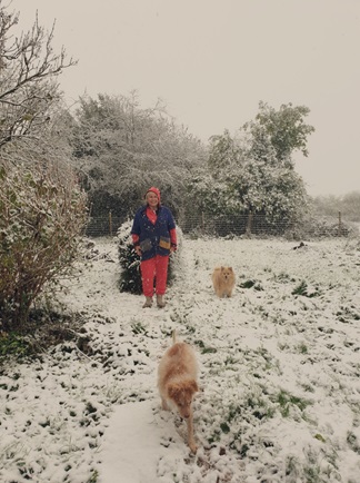 Eerst heb ik een heerlijke wandeling gemaakt met de honden. Scotty, onze dunbehaarde viervoeter, vond de sneeuw maar niks en bleef liever warm. Worffy daarentegen, onze keeshond met zijn dikke vacht, had de tijd van zijn leven. Ondertussen bleven de kippen lekker warm in hun stal, waar ik een extra laag stro had neergelegd. Voor wat extra verwennerij kregen ze warme havermout bij hun gebruikelijke kippenvoer en maïs. Ze zaten tevreden op hun strobaal te genieten. De paarden leken weinig last te hebben van de kou; met hun dikke wintervacht stonden ze rustig onder de beschutting, beschermd tegen de wind.