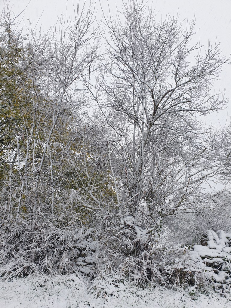 Vandaag viel er sneeuw in de Bourgogne! Het was niet veel, ongeveer 3 tot 5 cm, maar het gaf de ochtend een echt winters karakter. Een bijzondere gebeurtenis, want sneeuw in november maak je niet zo vaak mee in deze mate. Tegen de middag ging de sneeuw over in regen, en later op de dag stopte de neerslag helemaal. Ondanks de kou en een scherpe, nare wind ben ik toch naar buiten gegaan – sneeuw laat ik niet zomaar aan me voorbijgaan!