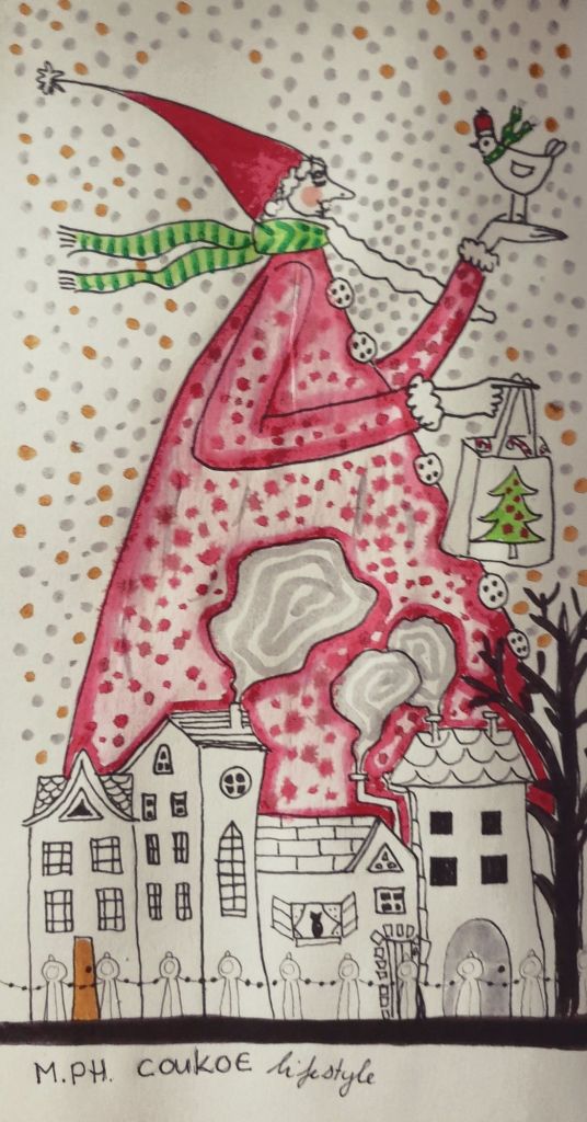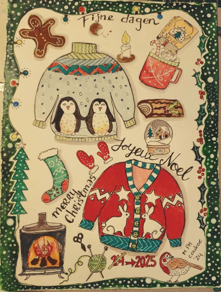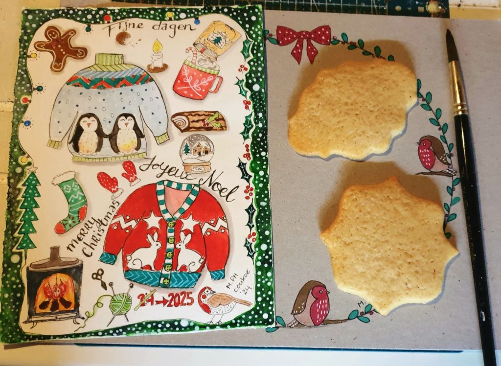Zelf heb ik de dag gevuld met het schilderen van kerstkaarten, een van mijn favoriete creatieve bezigheden, en het bakken van geurige zandkoekjes met extra vanillesmaak. Het huis voelt zalig warm en het ruikt er naar kerst—een echte traktatie op tafel en in ons hart. Vanavond staat er kip-groentensoep op het menu, gevolgd door een kop kamillethee met een lepeltje honing van bijen uit de Morvan.