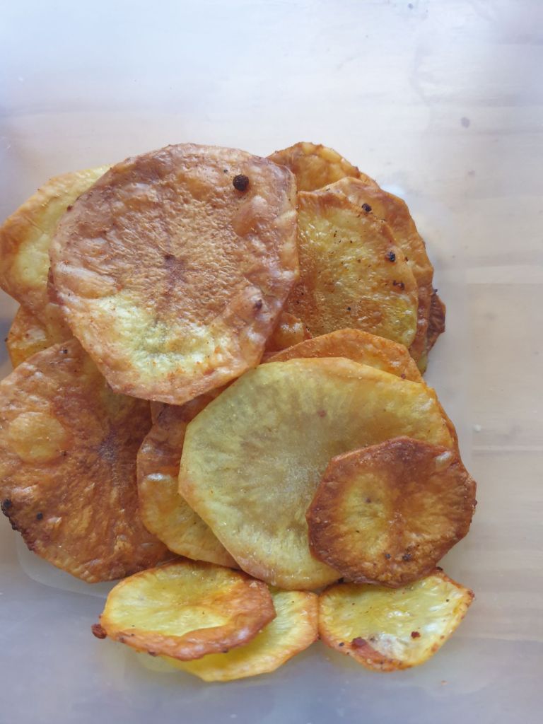 De kerstvoorbereidingen zijn bijna rond. Om de lokale boeren te steunen, hebben we een grote zak aardappelen en appels rechtstreeks van de boerderij gekocht. Mijn schoonzoon maakte er vandaag de lekkerste chips van: dun gesneden plakjes, gekruid met olie, peper, zout, paprikapoeder en knoflookpoeder, en daarna knapperig gebakken in de oven. Geen chips uit de winkel kan hier meer tegenop!