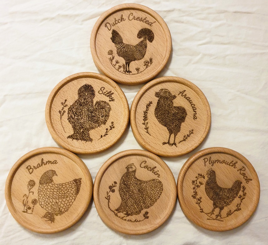 The coasters were initially designed for myself. Since I often share my chicken adventures through photos, videos, and stories, I received so many positive reactions. This inspired me to turn my chicken breeds into designs for a laser printer.