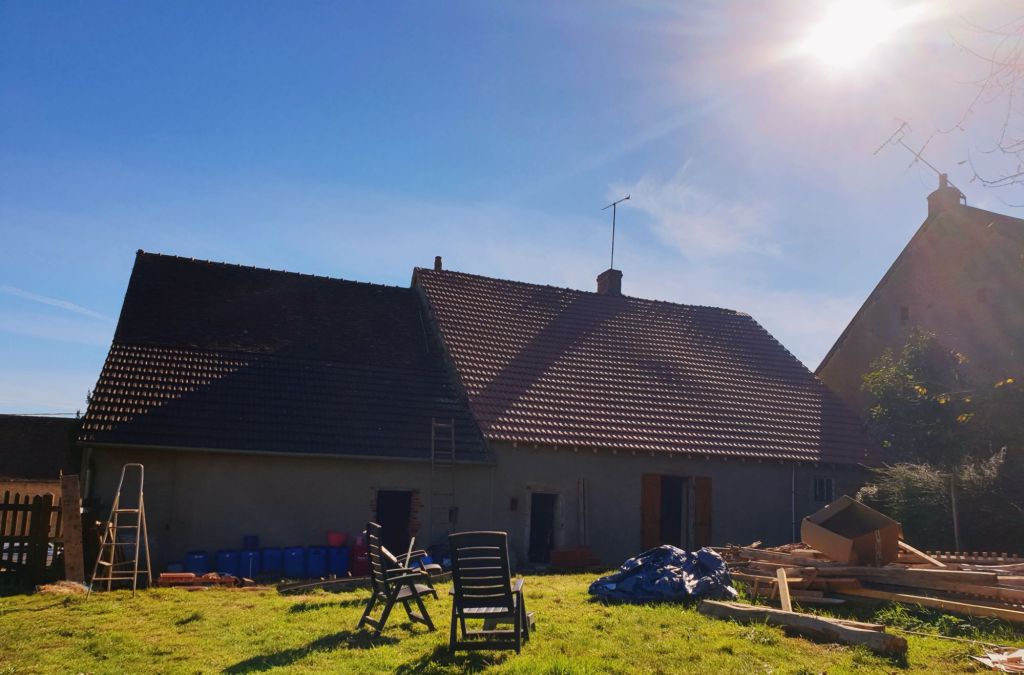 In de Bourgogne is het niet vanzelfsprekend dat je snel een dakdekker kunt vinden, en toentertijd was er ook nog een schaarste aan dakpannen. Uiteindelijk wist mijn Franse schoonzoon dakpannen te regelen, en mijn Nederlandse schoonzoon heeft het dak helemaal gemaakt. Het bleek geen kwestie van “even” het gat dichten – het hele dak moest eraf omdat het hout compleet verrot was. Een maand lang werkte hij eraan, en tegen het einde konden wij meehelpen met het aangeven en omhoog hijsen van dakpannen.
