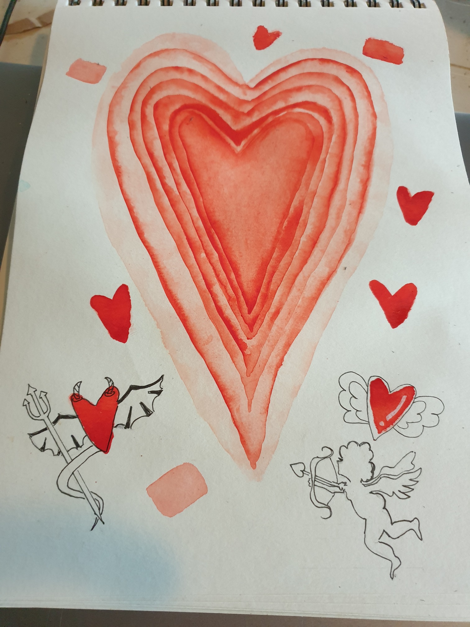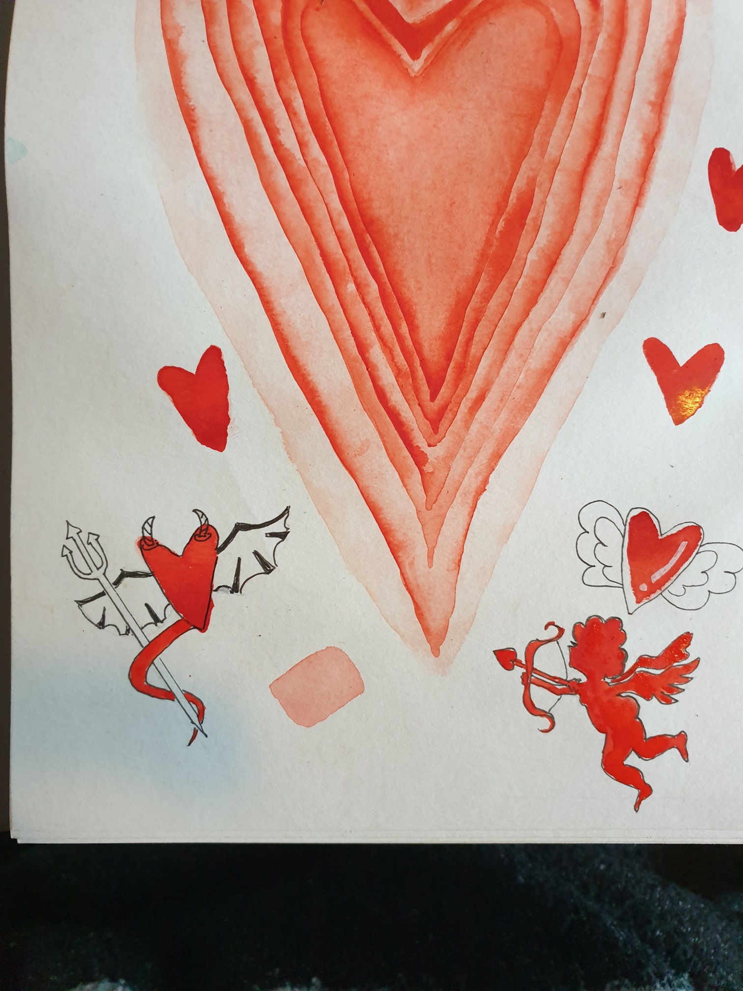 Voor mijn derde Valentijnskaart heb ik een speels laagjeshart gemaakt, versierd met kleine doodles zoals een envelop met een hartje, een cupido-engeltje en een duivelshartje. Dit ontwerp is perfect om je kwastbeheersing te oefenen. Begin met een groot hart, laat het goed drogen (met een föhn of aan de lucht), en schilder daarna een iets kleiner hart binnenin. Herhaal dit proces, waarbij je elke laag iets roder maakt door minder water of meer verf te gebruiken. De doodles heb ik later toegevoegd en alles omlijnd met een zwarte watervaste fineliner (0.3) – een beetje slordigheid mag voor een speels effect! Deze aquarel stimuleert mijn creativiteit en inspireert me steeds weer. Inclusief een stap-voor-stap foto voor extra duidelijkheid!