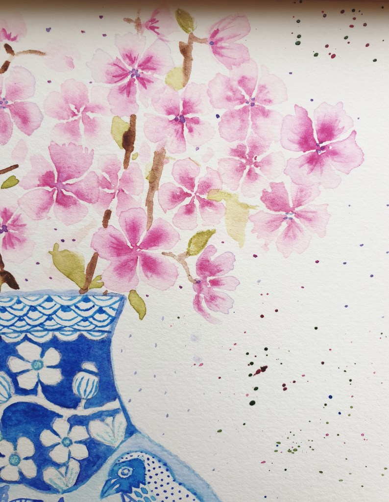 Voor dit werk heb ik zelf bedachte vogels gecombineerd met prachtige kersenbloesem, een element dat ik altijd al bewonder vanwege zijn tedere uitstraling en dromerige kleuren. De tinten die ik heb gebruikt zijn fantasierijk en niet per se realistisch, wat het werk een uniek karakter geeft. Ik heb geschilderd op 100% katoenpapier en gebruikgemaakt van hoogwaardige waterverfmerken. Eén van de kleuren die ik specifiek heb gekozen, is “Chinees blauw”, een tint die perfect past binnen de sfeer van Chinoiserie.