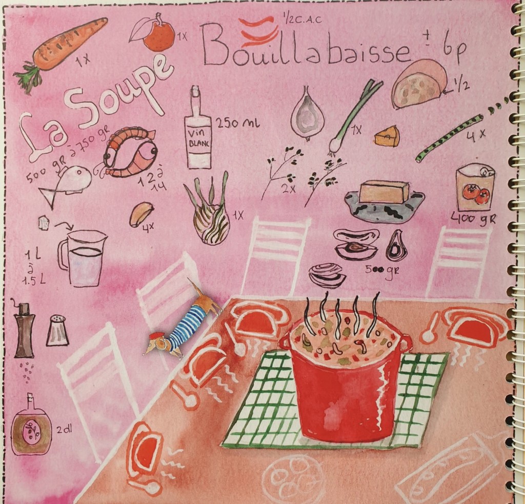 PS: Wil je het boek bestellen? Dat kan via het contactformulier! Als lente-aanbieding ontvang je het voor slechts €19,50, inclusief een Coukoe Lifestyle tas en twee theedoeken. Naast deze heerlijke vissoep vind je in het boek tal van Franse klassiekers, elk met een eigen sfeervolle recept-aquarel.