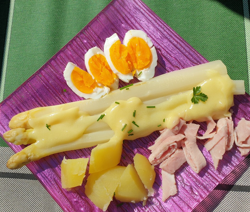 Voor het diner maakte ik de asperges klassiek klaar: met aardappeltjes, een middenzacht eitje van mijn eigen kipjes, een dikke plak ham en natuurlijk die zelfgeklopte saus. Wat verse kruiden uit de moestuin erover, en het bord was compleet.