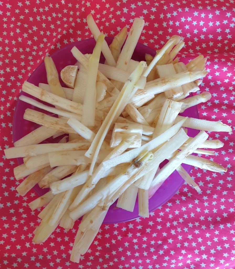 - Schil de asperges zorgvuldig en snijd de harde uiteinden af.