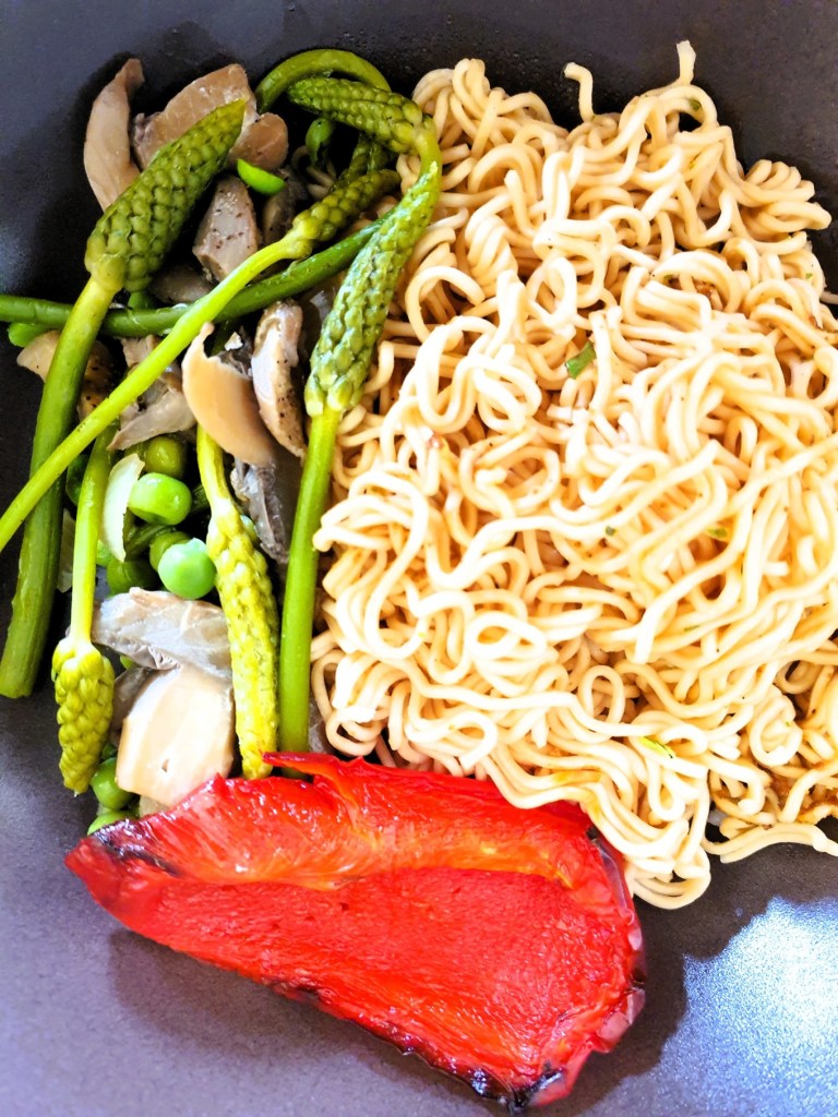 Het tweede gerecht is weer zo’n simpele topper uit mijn keuken – bomvol smaak en precies wat je wilt op een lentedag. De vers geplukte wilde asperges kookte ik 3 minuten in licht gezouten water en dompelde ze daarna direct in ijskoud water om hun bite en kleur te behouden. In de wok gingen vervolgens verse champignons en groene tuin-erwtjes mee, en ik combineerde alles met noedels (rijst kan natuurlijk ook). Als extraatje roosterde ik een rode paprika die ik nog over had – want ik hou van lekker, maar ook van zero waste. Een makkelijk, voedzaam en kleurrijk gerecht dat bewijst dat simpel vaak het allerlekkerst is.