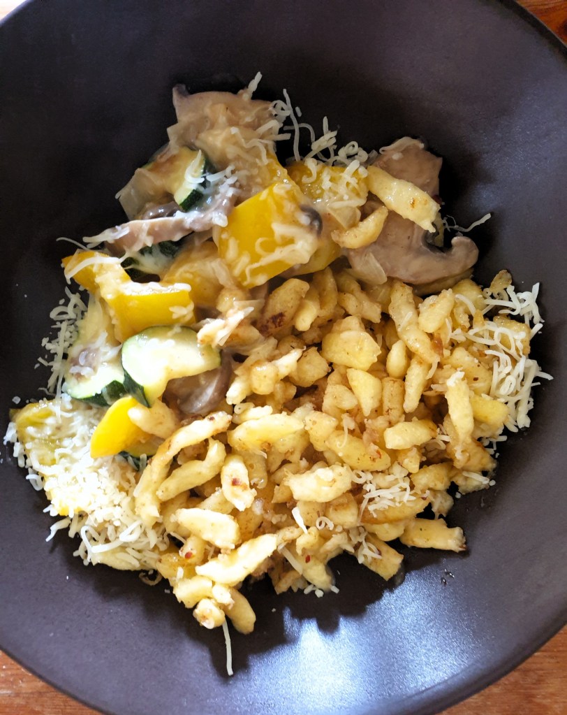 Geserveerd met gekaramelliseerde uien, wat groenten, en dan een keuze tussen gesmolten kaas of gestoofd vlees met veel saus: het is een feestmaal. Kässpätzle met een mix van zachte en pittige kazen als Comté of Gruyère is mijn favoriet!