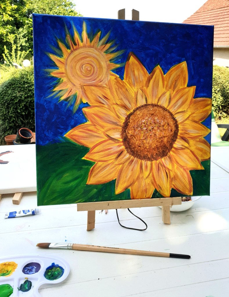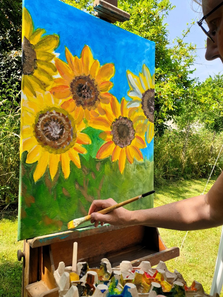 gaven wij – Lies en Pien van team Coukoelifestyle – gisteren een betoverende workshop met als thema de zonnebloem. In de schaduw van oude bomen en omringd door de zomerse geuren en geluiden van het Franse platteland, veranderden witte doeken langzaam in zonnige meesterwerken.
