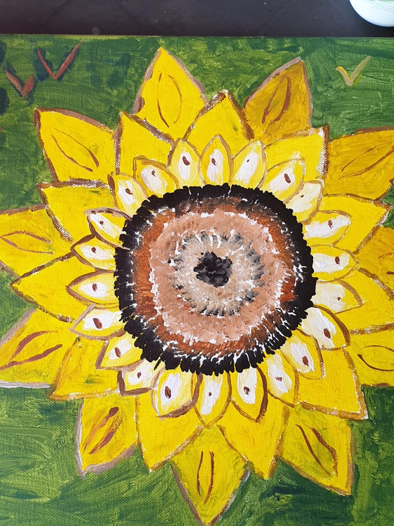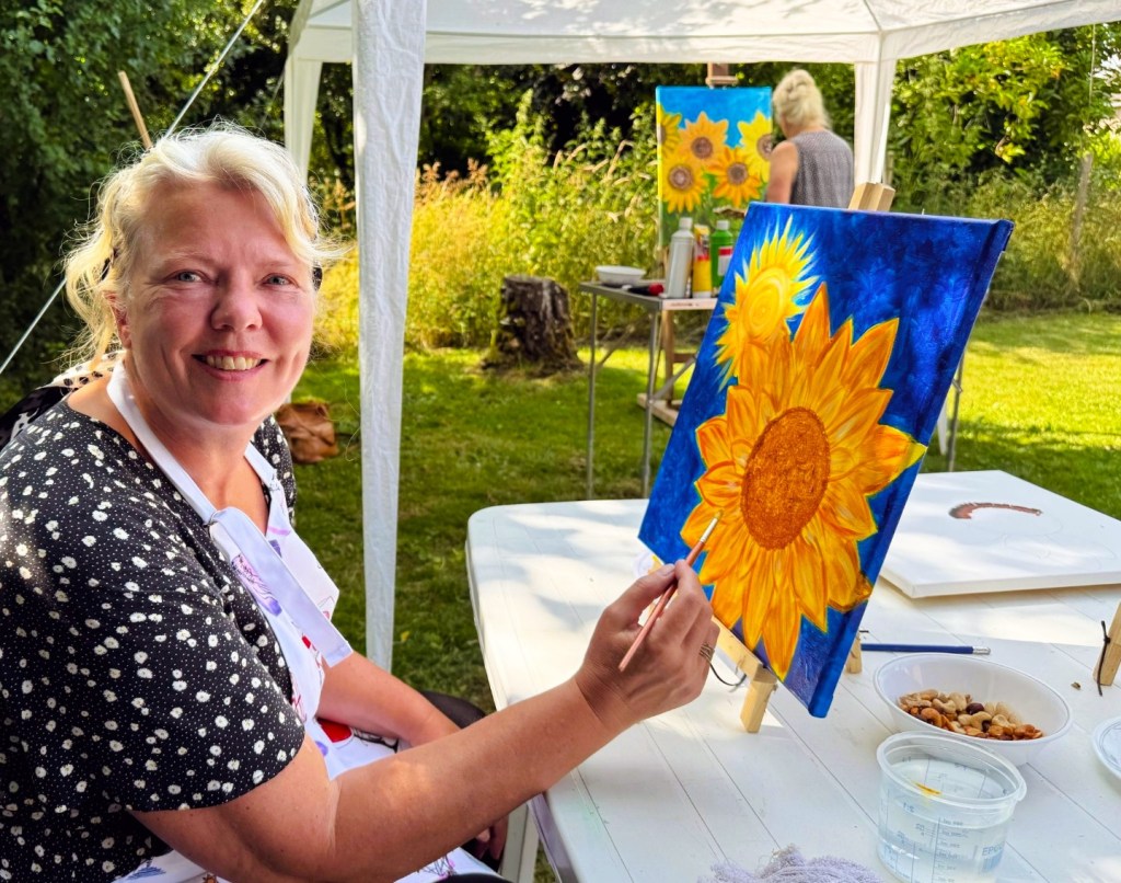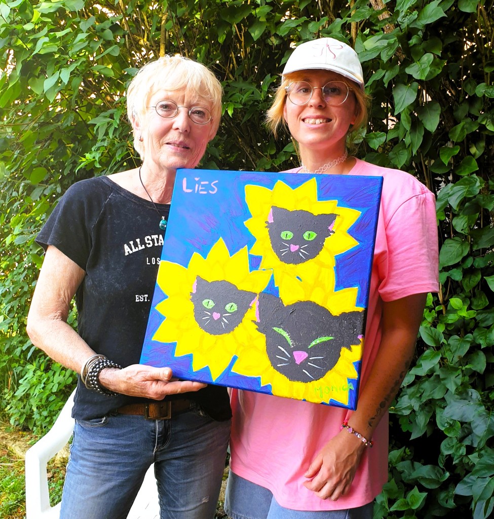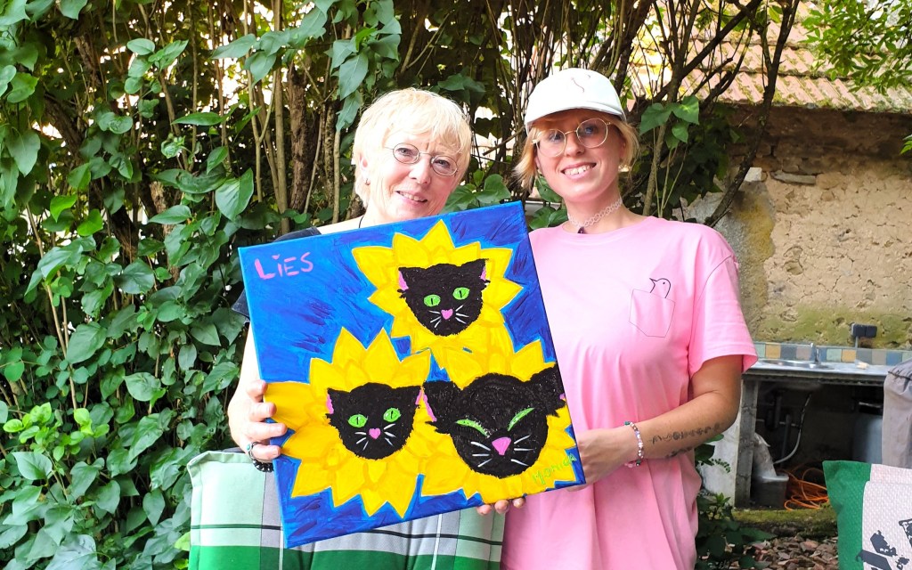 Met penseel, verf, en waar gewenst een handige mal, ontstonden stap voor stap de prachtigste creaties. Iedereen bracht iets unieks op het doek: van dromerig tot expressief, kleurrijk en krachtig. Zelfs Plops, die gezellig met Door was meegekomen, vond z’n plek tussen de zonnebloemen en werd vereeuwigd in verf.