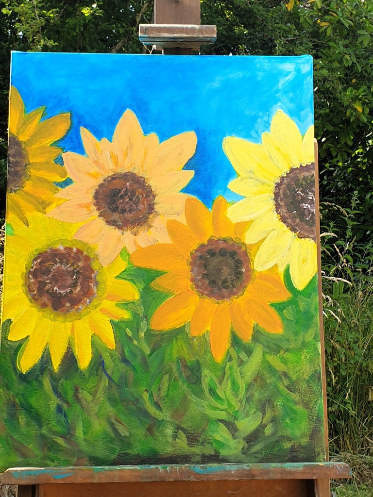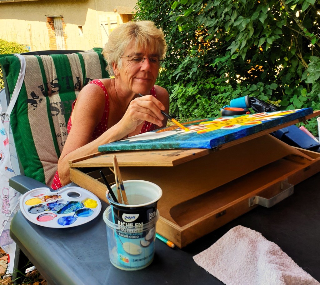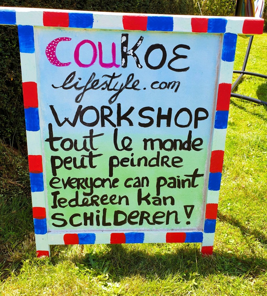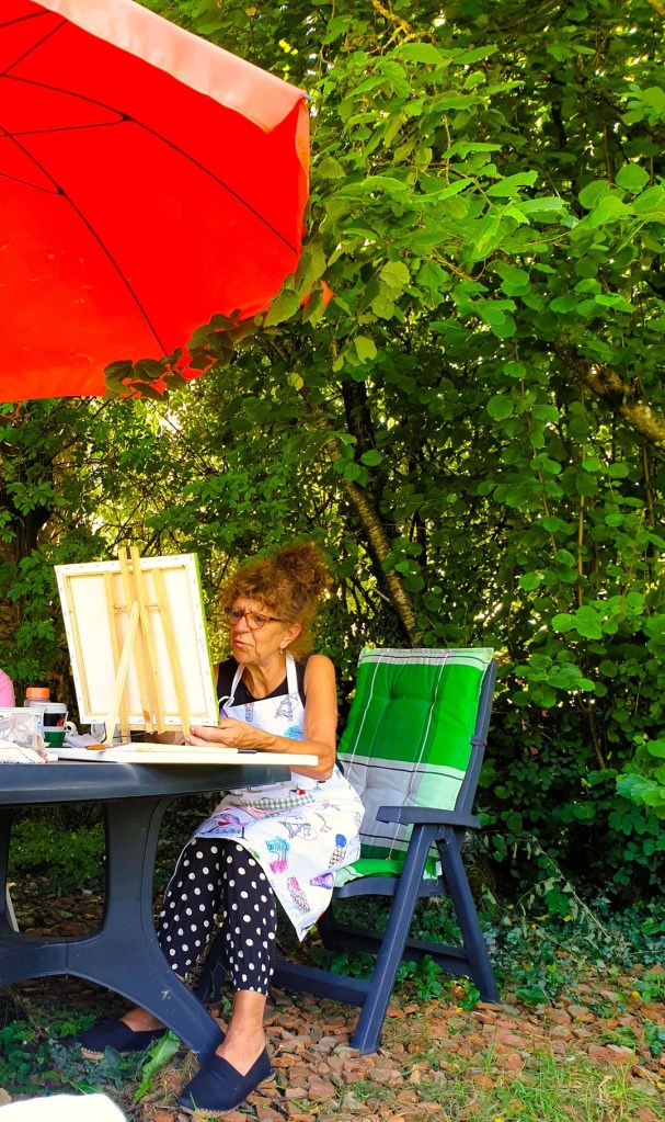 En ja, het was warm – een goede dertig graden – maar gelukkig kwam Toob, mijn schoonzoon, op het perfecte moment met een schaduwrijke tent. Alles klopte: de zon, de mensen, de kleuren, de smaken, het lachen, het maken. Wat een feest om zo buiten te schilderen, wat een dag om te koesteren.