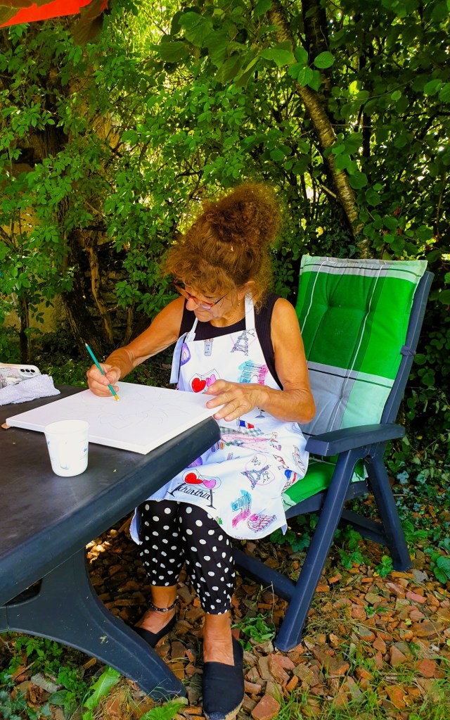 De sfeer was ongedwongen en zomers: we genoten van sprankelend water, verse kersen, chocolade vol noten, clafoutis, tarte flambée – en op de achtergrond Franse chansons die het plaatje compleet maakten. De kipjes lagen loom in de schaduw van de struiken, alsof ze stilletjes meegenoten van ons creatieve samenzijn.