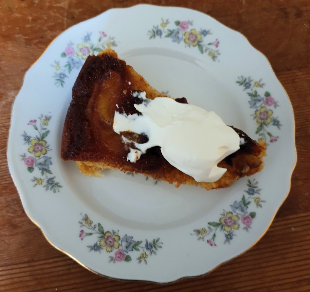 De taart van vandaag had zo z’n eigen avontuur. Twee ovens die dienst weigerden en een ochtend vol vloeken en improviseren eindigden in een heerlijke koekenpantaart – een omgekeerde appeltaart, goudbruin gekaramelliseerd in de pan. Vers gemaakt van eieren, citroenrasp, crème fraîche en een topping van appels, boter, suiker en kaneel. Met een beetje geduld en een deksel van glas kwam het allemaal goed. Ik bewaarde hem koel in een thermostas met een bol crème fraîche ernaast. Thee erbij – earl grey – en water met zout en suiker voor de hydratatie
