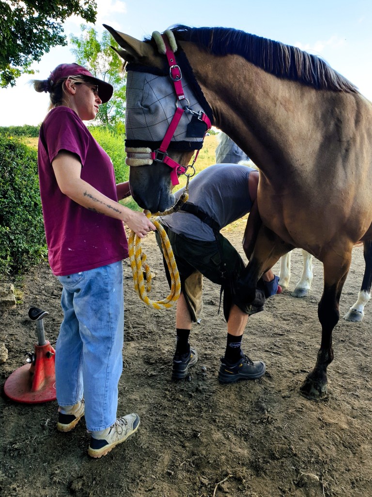 In het glooiende hart van de Bourgogne, tussen de uitgestrekte weilanden waar onze paarden vrij lopen, vond dit zomerse tafereel plaats. Ik rijd samen met Lies in onze 4×4 om de paarden te bereiken; Jeroen, onze Nederlandse hoefsmid, komt met zijn eigen terreinwagen. Het is heet, de zon brandt, en de steekvliegen zijn meedogenloos. Maar met een mix van vaseline en vliegenspray houden we ze op afstand – en ondanks de hitte is het weer gelukt: de hoeven zijn netjes bekapt, de paarden gezond en tevreden.