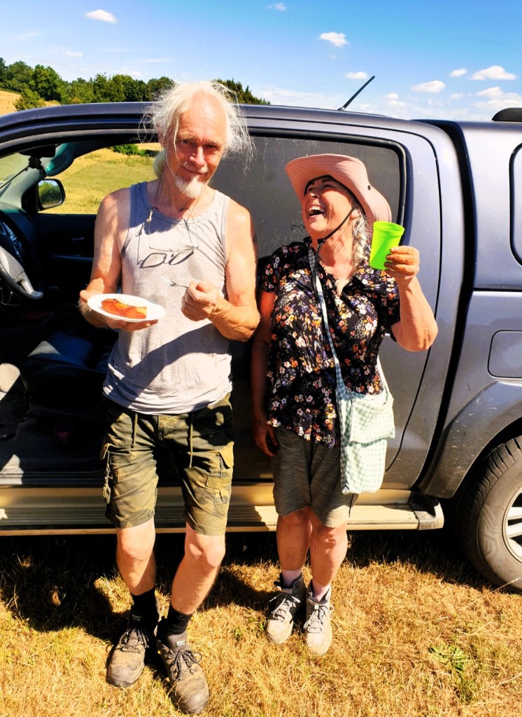 Na afloop is het vaste prik: een kop thee uit de thermosfles, een zelfgebakken taartje en gezellig napraten in de schaduw van de auto. Deze keer wilde ik zelf eens op de foto met Jeroen – geen gestylede opname, maar een royale lach, een hoed tegen de zon, zweethaar, geschaafde benen van de bramen, en plakhanden van de liksteen waarmee we de paarden rustig houden tijdens het bekappen. Een oude korte broek en grote schoenen, waarmee we stevig hechten aan het ongelijkmatige weiland. In een wereld vol filters is het juist dát wat echt geluk laat zien. En ja, ik had kunnen kiezen voor een gestroomlijnde, mooie foto – maar is dit niet véél leuker?