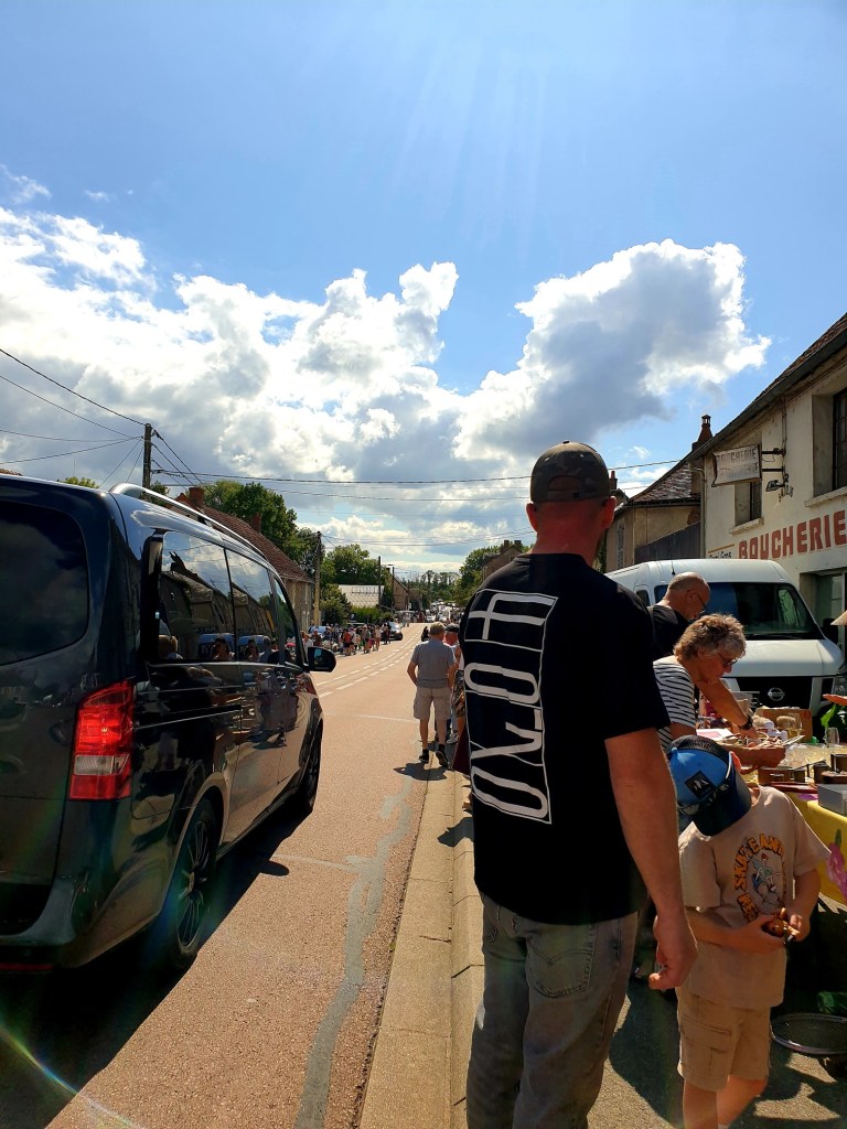 De zon liet zich zien, maar er hing ook wat bewolking in de lucht – eigenlijk wel prettig, want het maakte de temperatuur net wat aangenamer. Samen met mijn dochter en schoonzoon zette ik koers naar Tamnay-en-Bazois, een klein dorp op de route tussen Nevers en Château-Chinon. In deze tijd van het jaar duikt er elk weekend wel ergens in de Bourgogne een brocante op — en ik blijf nieuwsgierig.