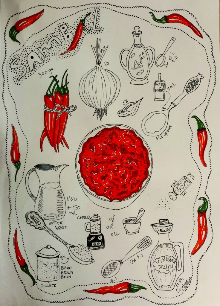 Mijn liefde voor sambal begon niet in Frankrijk, maar in Nederland. Ik hielp ooit een vriendin in haar kleine, industriële keuken, waar ze met haarnetje en handschoenen sambal en delicatessen maakte voor de markt. Haar eenvoudige glazen potten met statiegeldsysteem en prachtige vintage etiketten fascineerden me. Daar leerde ik: koken is meer dan eten bereiden, het is een verhaal dat je deelt. Haar recept nam ik mee, maar inmiddels heb ik er mijn eigen draai aan gegeven.