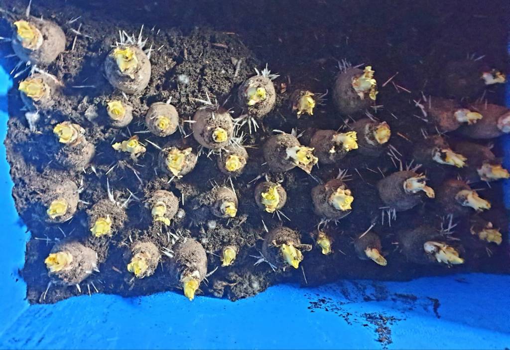 Ik vulde een bak met ongeveer tien centimeter zaai- en stekgrond. Oude potgrond uit bloembakken kan hier ook prima voor dienen. De grond hoeft niet heel rijk aan voeding te zijn. De wortels zette ik vrij dicht tegen elkaar aan, zodat ze mooie compacte kropjes zouden vormen, maar wel met net genoeg ruimte om te groeien. Tijdens het plaatsen drukte ik de grond goed aan en gaf ik water (plantenspuit) zodat de aarde netjes tussen de wortels kon zakken. Daarna gaf ik één keer per week een beetje water met een plantenspuit.