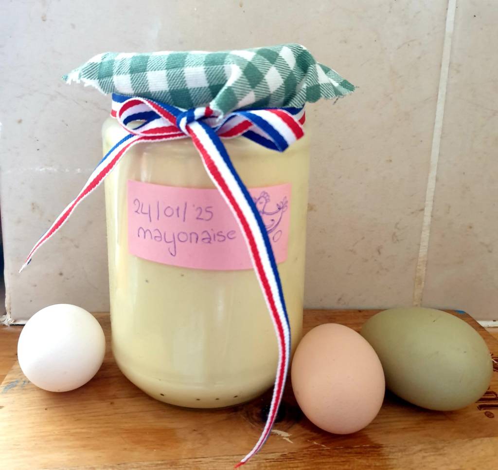 Voor de mayonaise: meng in een kom 1 eidooier met 1 el fijne mosterd, 1 el neutrale azijn of citroensap en zout en peper. Schenk er langzaam 250 ml arachide-, maïs- of zonnebloemolie bij terwijl je stevig klopt met een garde of handmixer zodat de olie volledig wordt opgenomen. Klop daarna nog even door tot een mooie, romige mayonaise ontstaat.