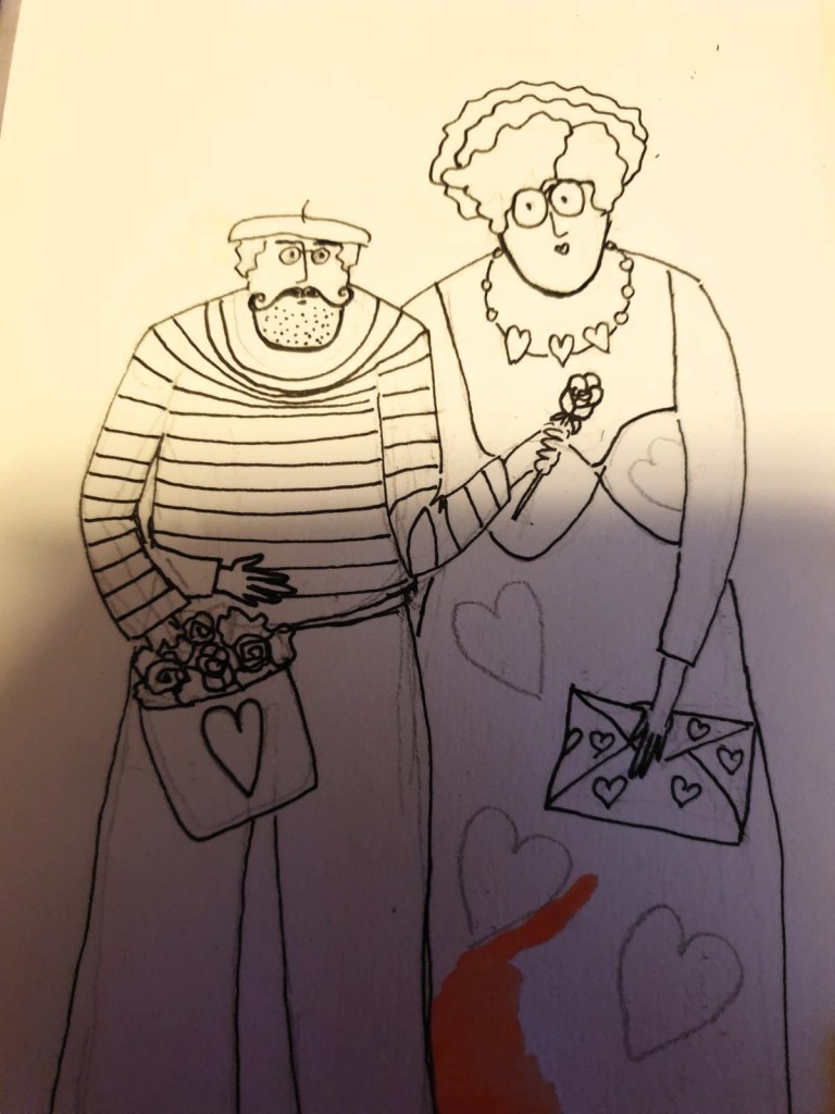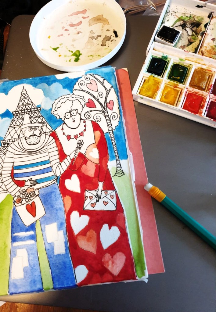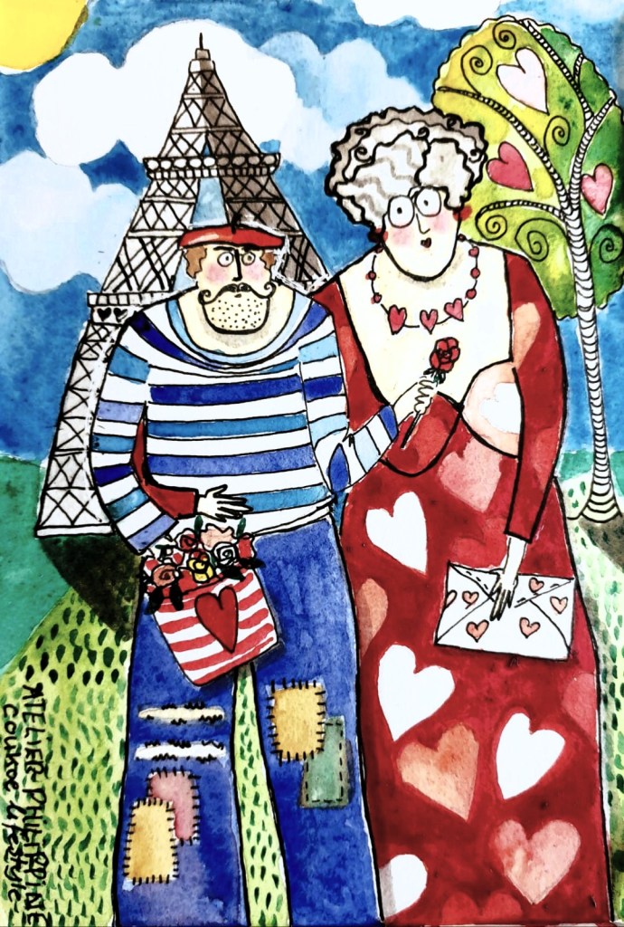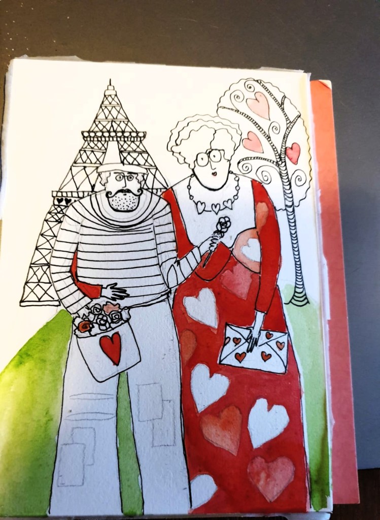 Pierre en Marie zijn vandaag in Parijs, speciaal voor Valentijn. Marie draagt haar mooiste jurk, Pierre heeft rozen gekocht en overhandigt ze haar in de stad van de romantiek. Een klein gebaar, een groot gevoel. Ik heb dit tafereel vastgelegd in een aquarel, geschilderd onder het genot van een rood linzenbroodje met een eitje van mijn eigen kipjes — eenvoud, kleur en liefde aan tafel.