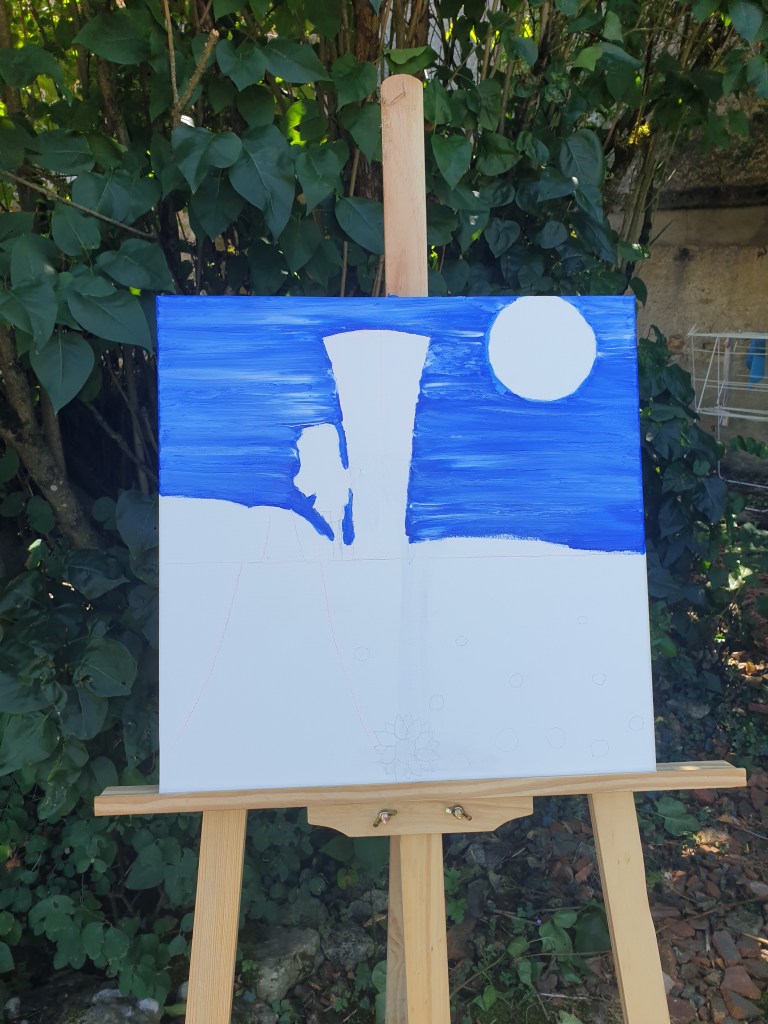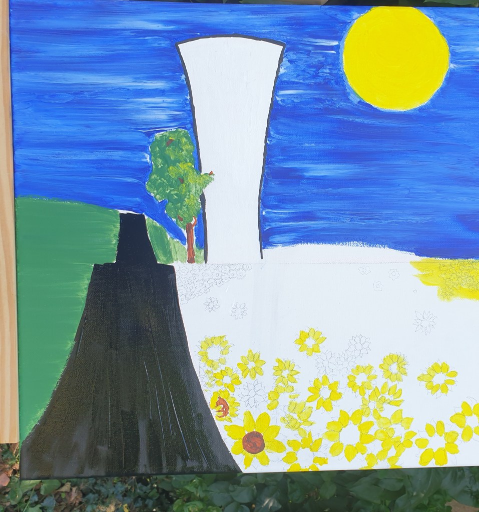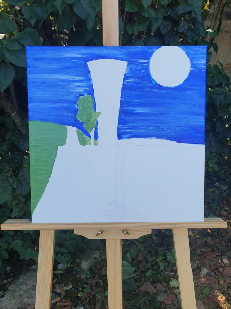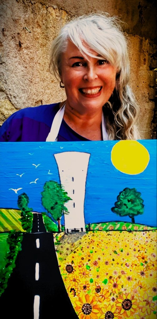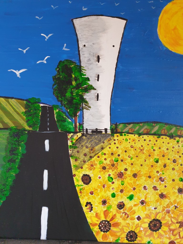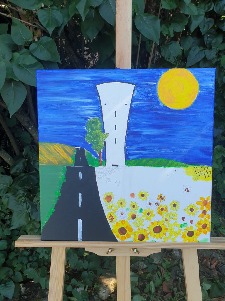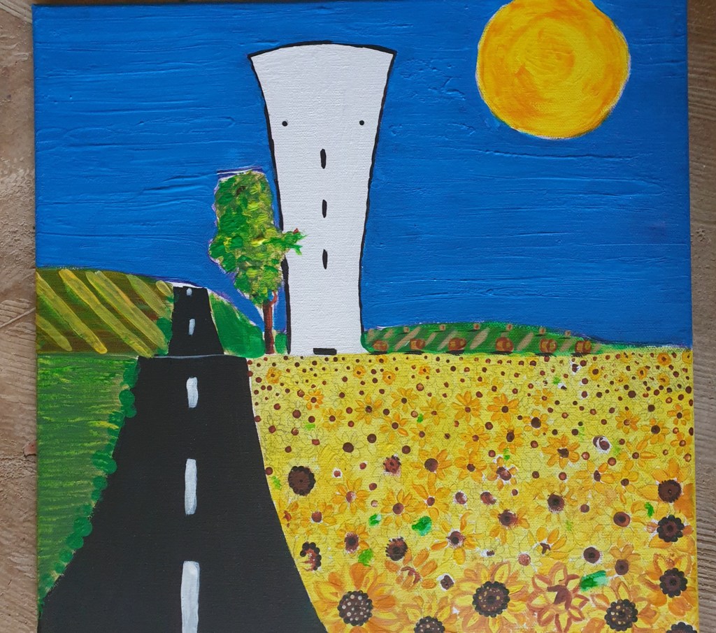 Op de route van Châttillon-en-Bazois via Alluy naar Saint-Saulge staat de watertoren met het gezicht (Château d’eau) die me iedere keer opnieuw lijkt te begroeten. Alsof er een vriendelijk gezicht op getekend is dat naar buiten kijkt, een herkenning, elke dag weer. Ik rij er bijna dagelijks langs en al vanaf het allereerste moment wist ik: deze moet ik vastleggen. Dat is dan de creatieve kunstenares in mij, die haar penselen wil pakken en de watertoren wil vereeuwigen.
