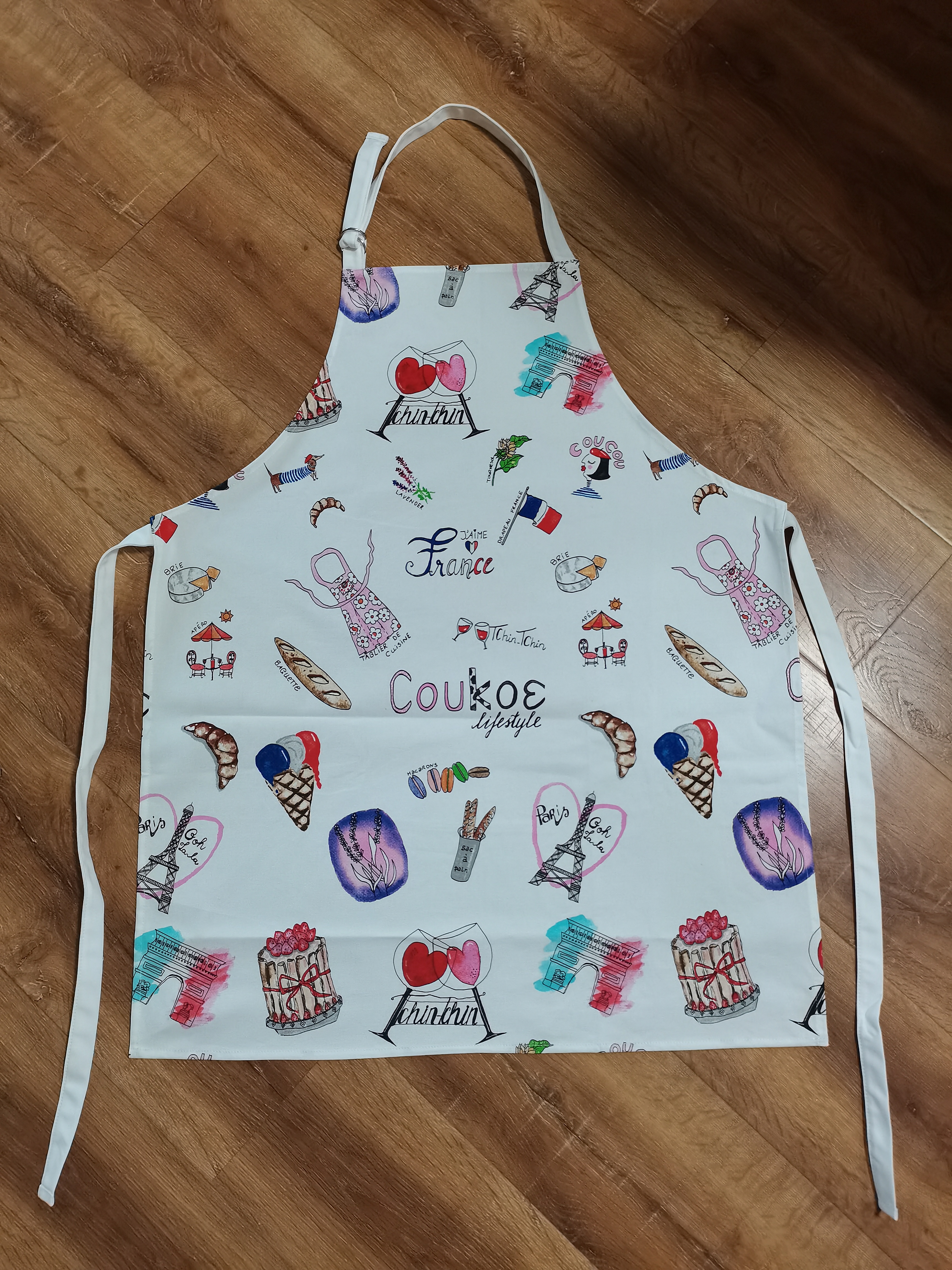Breng een vleugje Franse elegantie in je keuken met ons stijlvolle witte schort, gemaakt van 100% katoen en versierd met unieke, met de hand geschilderde aquarelillustraties van Franse iconen. Dit schort behoudt zijn kleur en charme, zelfs na veelvuldig wassen, en heeft een verstelbare nekband voor optimaal draagcomfort. Combineer het met onze tote bag of theedoeken met Franse iconen voor een prachtig cadeau. Of het nu voor een dierbare is of voor jezelf, dit schort voegt zowel stijl als functionaliteit toe aan elke kookervaring. Uit eigen ervaring weet ik hoeveel bewondering dit schort oproept – het is niet alleen een praktisch keukengebruik, maar ook een modieus accessoire dat de aandacht trekt van gasten. Voor de beste verzorging was je het schort op lage temperatuur om de illustraties en vorm te behouden. Gebruik geen droger.
