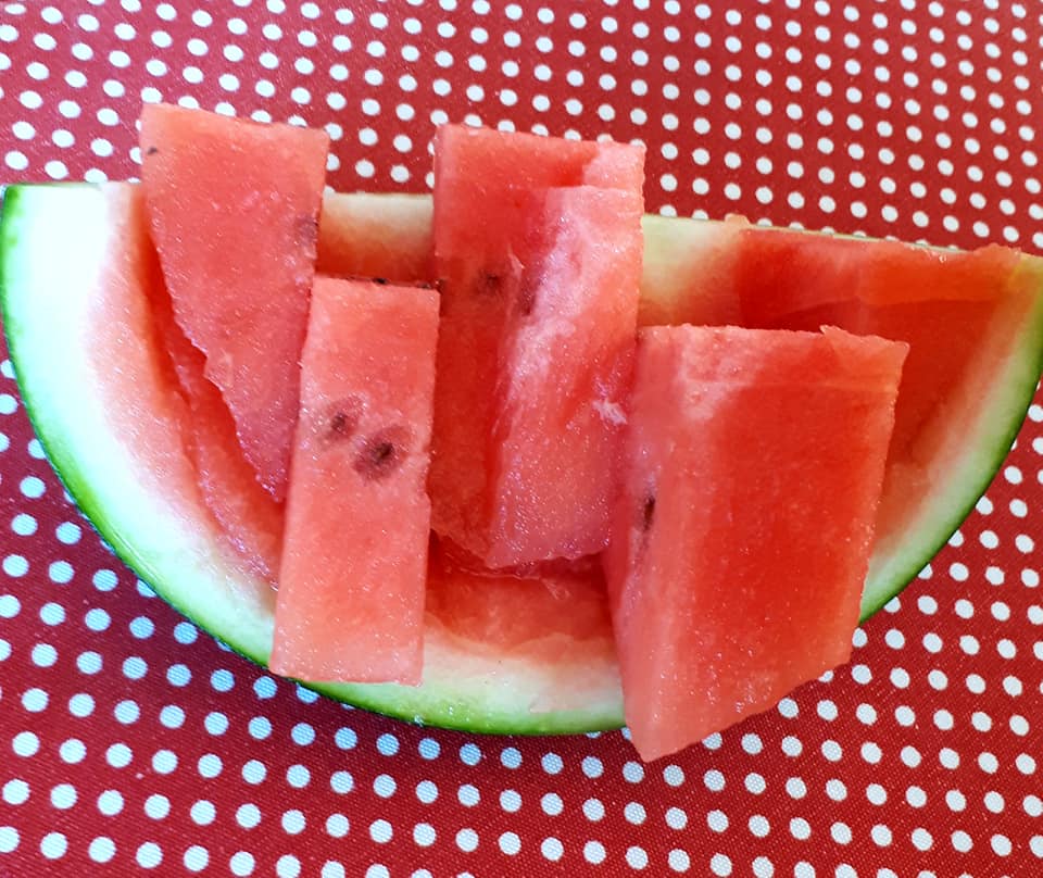 - Snijd de watermeloen in blokjes en leg ze op een serveerschaal.